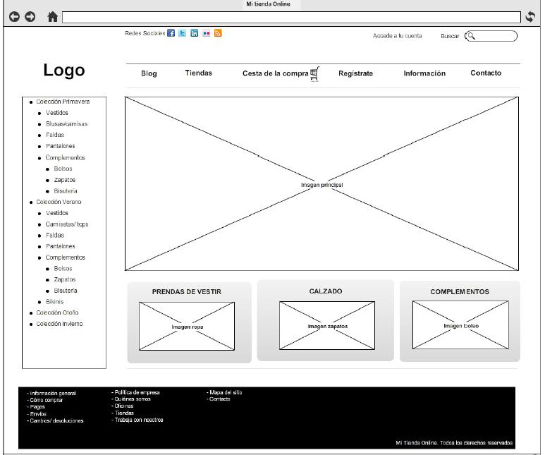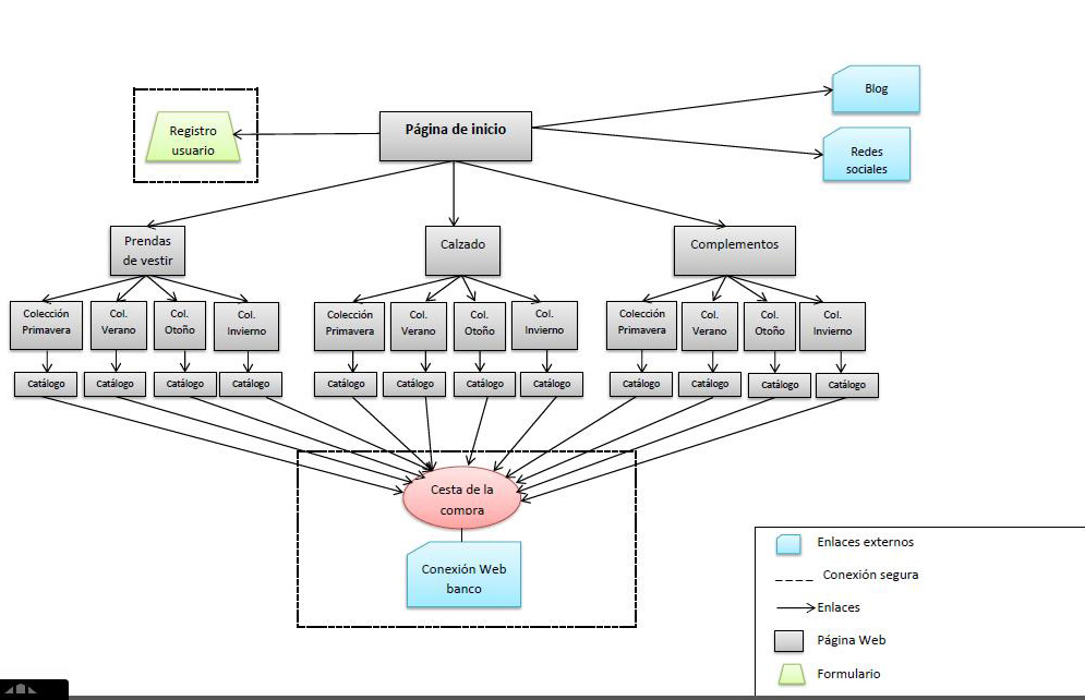 La estructura sería la siguiente: la página principal enlaza con todas las páginas del sitio (enlaces internos) que pueden ser de dos clases, por una parte las páginas relativas a los catálogos de los productos (a las que se accede pinchando en el menú de la izquierda o en las imágenes pequeñitas de la parte de abajo, tituladas “prendas de vestir”, “calzado” y “complementos”) y por otro lado, las páginas que nos llevan a la información corporativa, información sobre funcionamiento de la página, etc. Además, esta página también cuenta con enlaces a redes sociales y al blog (enlaces externos). De la misma manera, hay dos páginas muy seguras, que son el registro de usuarios y la cesta de la compra, con la posterior conexión bancaria.