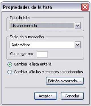 3. La lista debe ser numerada con números o letras, según más os guste, cread por lo menos 5 elementos. Os podéis ayudar del menú Formato > Lista > Numerada . Una vez creada la lista podréis configurar todas las características de ésta, tanto en estilo como en formatos de viñeta o número según vuestras preferencias seleccionando los diferentes elementos de la lista y haciendo clic en el botón derecho se abrirá un menú donde escoger la opción "Propiedades de la lista...".