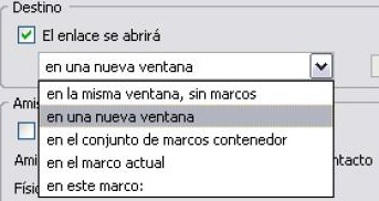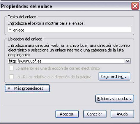 NOTA: si queréis que el enlace se abra en una ventana nueva, haced clic en el botón "Más propiedades" dentro de la caja de edición del enlace. Veréis una casilla llamada "Destino" donde nos dice: "El enlace se abrirá", podemos marcarla y escoger del desplegable la opción "En una ventana nueva".