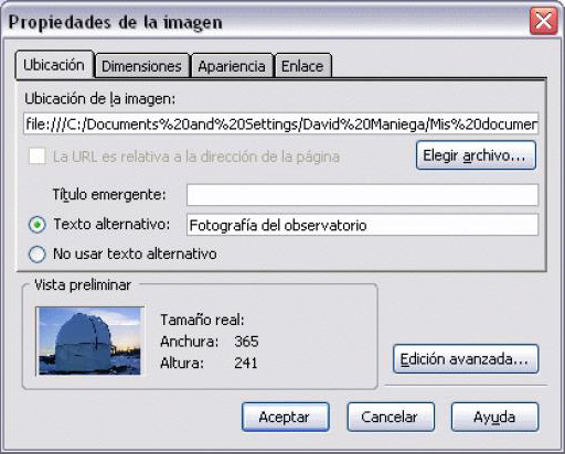 5. Cuando insertamos una imagen aseguraos de asignar un texto alternativo a la imagen (atributo ALT) en el campo correspondiente. Si no lo rellenáis, el editor mostrará una ventana de alerta donde nos indica que no lo hemos puesto. En caso de quererlo modificar una vez incluida la imagen, bastará hacer doble clic sobre la imagen y aparecerá el menú flotante con las características de definición de la imagen.