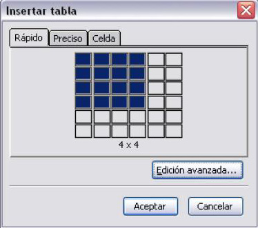 6. Haced que toda la fila superior y sólo esta, tenga un color de fondo diferente al resto de las filas que forman la columna. Os podéis ayudar del menú Tabla > Insertar > Tabla... o bien desde el botón activando la caja de creación de una tabla desde donde definimos las celdas que queremos que tenga la tabla.